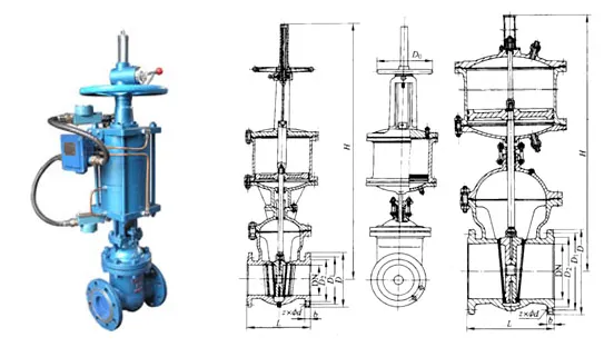 Z6s41H、Z6s41Y、Z6s41F型气动带手动楔式闸阀是具有气动执行机构(双层气缸,并带有缓冲机构)和手动及其保护机构(手动和可自锁的气动手动转换装置)的低支架明杆闸阀。该阀由于采用双层气缸结构,其与单气缸式气动闸阀相比,提升力增大了一倍。这就从根本上解决了单气缸气动闸阀的某些阀板在阀体内楔死而打不开的弊病。而且,由于该阀具备缓冲机构,能有效地减轻了关闭阀门时。由于活塞下行冲击而造成的阀板密封面和阀体密封面的磨损,同时,也能避免闸板卡死的现象。